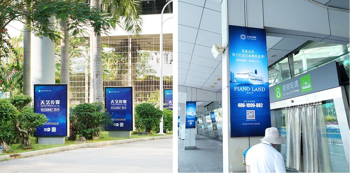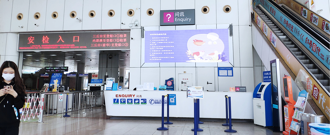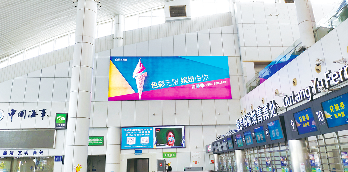 媒體位置設(shè)立于廣場(chǎng)/外圍,售票大廳,候船大廳,乘船通道,南北出入口等區(qū)域